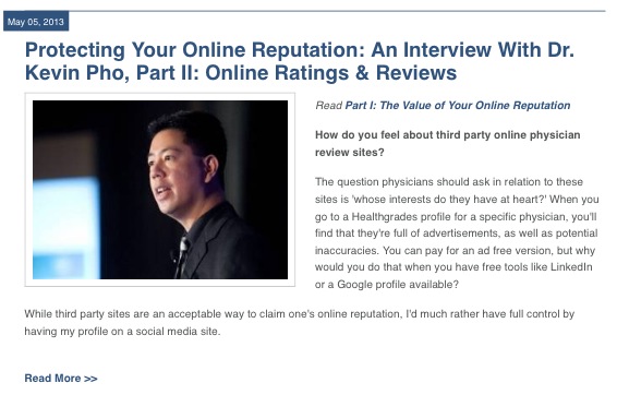 Getting doctors to adopt social media isn’t always an easy sell. That’s essentially Kevin Pho‘s whole shtick, though. In fact, he’s likely the leading authority for internet-based medicine, and has become somewhat of an authority on this niche of professional medicine. Through a unique freelance assignment, I was able to interview Pho about his recently published book (Establishing, Managing, and Protecting Your Online Reputation: A Social Media Guide for Physicians and Medical Practices) for his firsthand glimpse of how social media is inherently necessary for physicians to succeed. The interview was conducted over the phone and in my car during a lunch break at my day job (writing ad copy for a Beauty Supply Company), and turned out very well, even getting some traction in the medical blogosphere. Pho continues to stay on the physician radar thanks in part to his site which produces and curates blog content from various figures within the medical world (physicians, patients, etc.). The 2-part interview was posted online and published as a 2-part series in Physician’s Office Resource Magazine. Read it here.