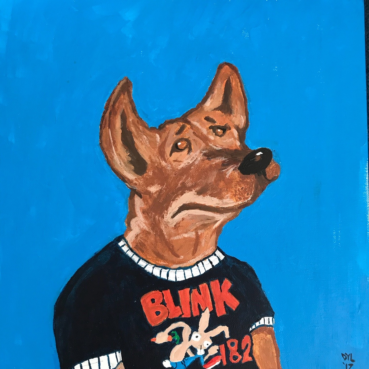 Luna the Pit mix in a Blink 182 shirt, Acrylic on Canvas 12×12